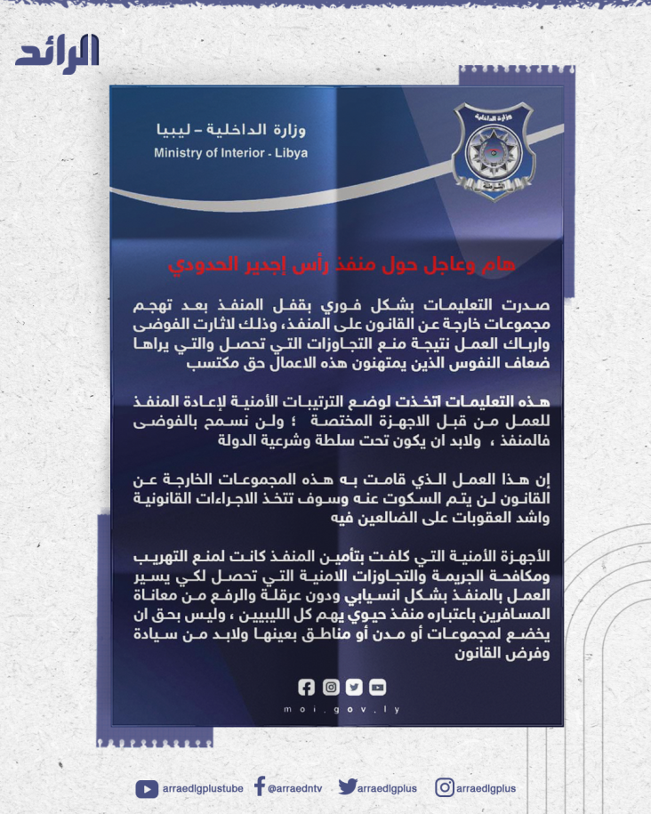 أصدرت وزارة الداخلية بحكومة الدبيبة قرارا بقفل منفذ رأس اجدير؛ بسبب ما قالت إنه تهجم من مجموعات خارجة عن القانون على المنفذ، لإثارة الفوضى وإرباك العمل.