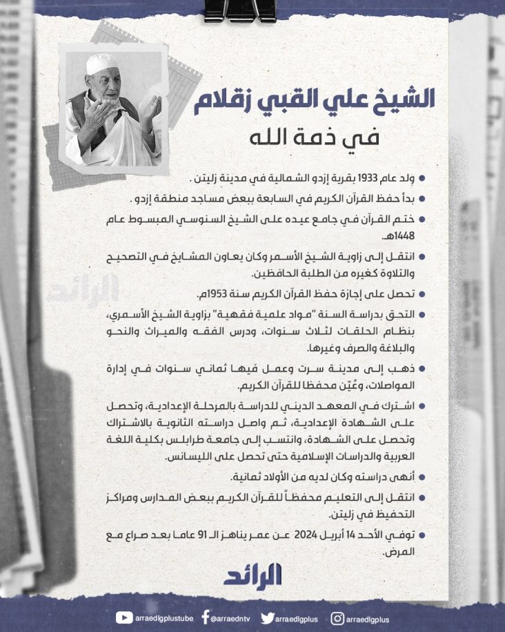 in إنفوجرافيك عن عمر يناهز 90 عاما.. الشيخ علي القبي زقلام في ذمة الله.. تعرف على سيرته by إبراهيم العربي 2024-04-14, 10:34 م 0 Votes What do you think? 0 نقاط Upvote Downvote كُتب بواسطة إبراهيم العربي