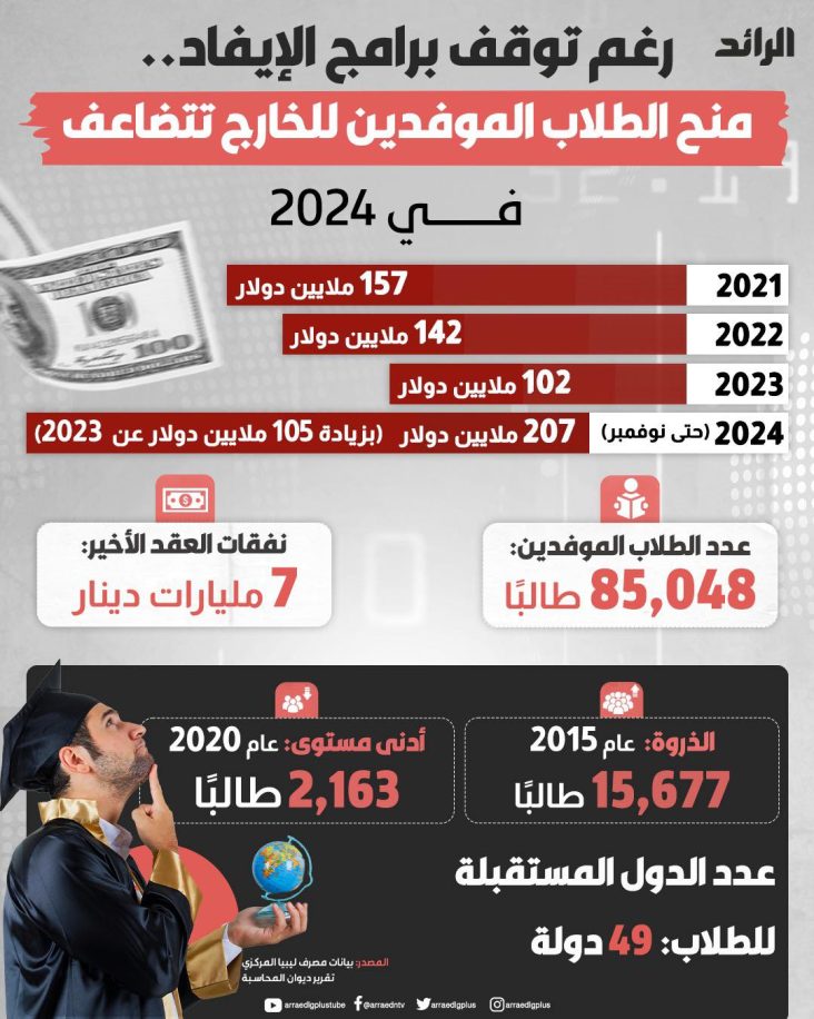 ورغم تناقص عدد الموفدين وتوقف إرسال جدد خلال السنوات الأخيرة إلا أن منح الطلبة تضاعفت من 102 مليون دولار في 2023 إلى 207 ملايين في العام الجاري..
