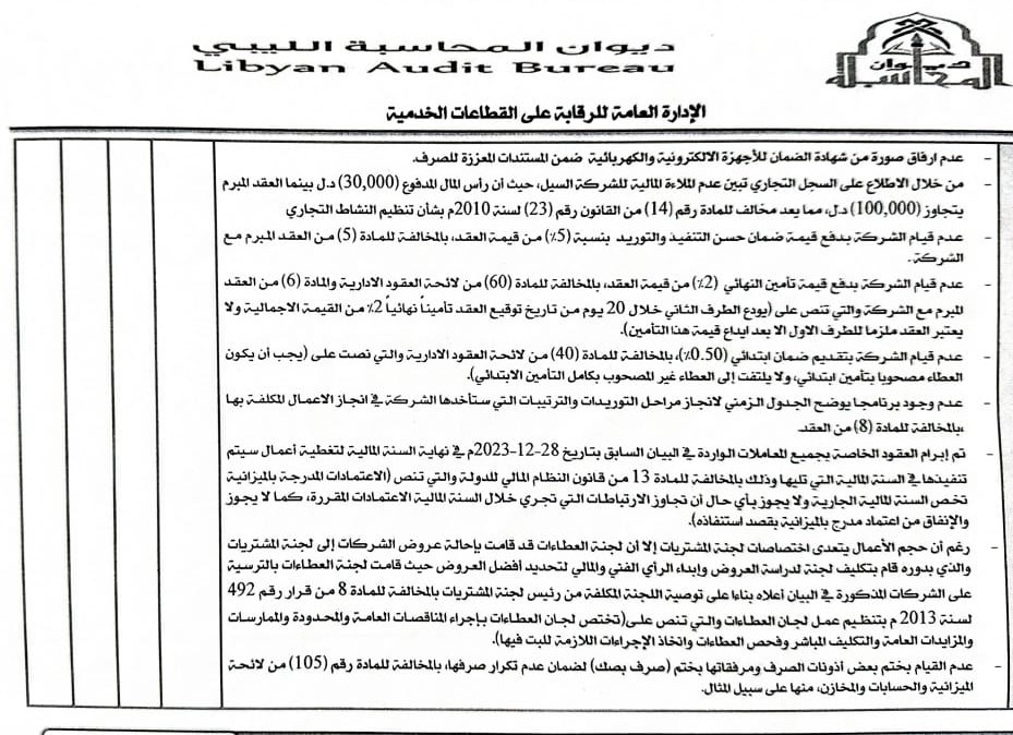 وأكد التقرير أن الجهاز قام بتعلية قيمة العقد رغم أن رأس مال الشركة لا يتجاوز 30 ألف دينار، كما لم يتم إرفاق شهادة ضمان الأجهزة ضمن مستندات الصرف.