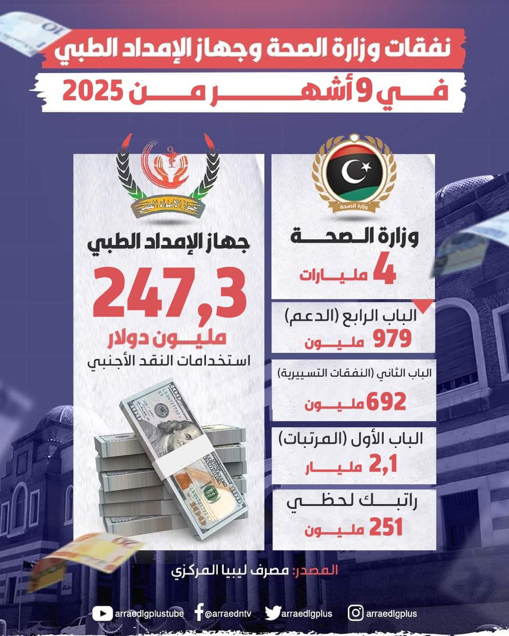 بلغت نفقات وزارة الصحة بحكومة #الدبيبة والجهات التابعة لها من يناير – سبتمبر 2025 نحو 4 مليارات دينار منها أكثر من 690 مليون من باب النفقات التسييرية، بينما بلغت نفقات جهاز الإمداد الطبي عن نفس الفترة أكثر من 247 مليون دولار من استخدامات النقد الأجنبي.