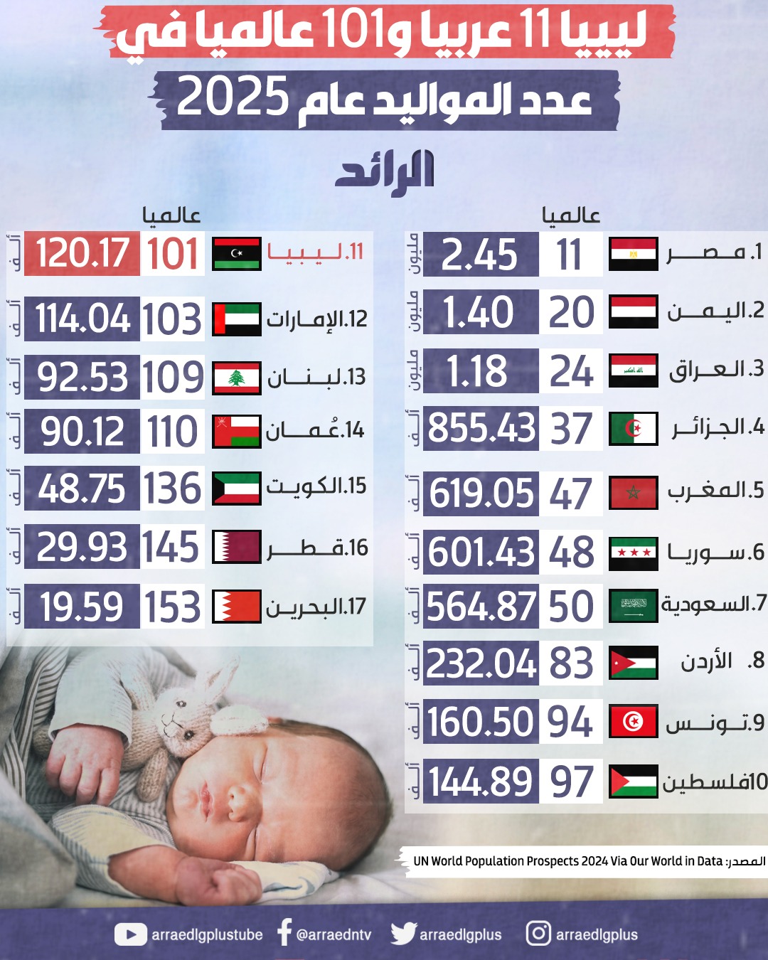 بحسب تقرير عن الأمم المتحدة، جاءت مصر في المرتبة الأولى عربيًا، والحادية عشرة عالميًا، من حيث عدد المواليد في عام 2025، بما يقارب 2.4 مليون مولود، يليها اليمن بنحو 1.4 مليون، وفي المركز الثالث جاءت العراق بـ1.1 مليون مولود، في حين حلّت ليبيا في المرتبة 11 عربيًا والـ101 عالميًا بـ120.17 ألف مولود.
