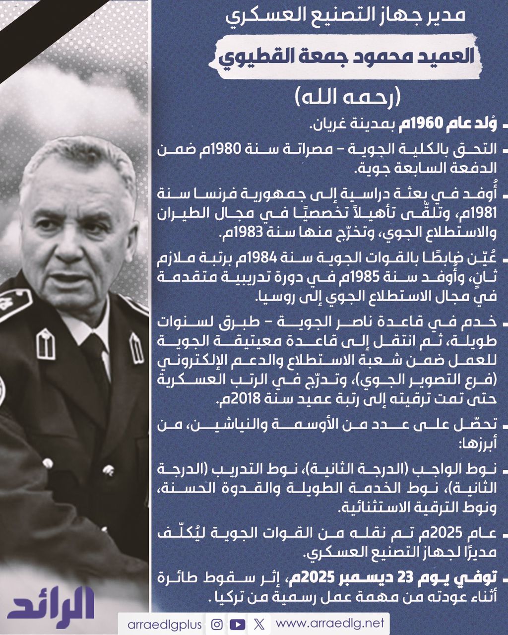 in إنفوجرافيك أحد ضحايا طائرة أنقرة المنكوبة.. مدير جهاز التصنيع العسكري العميد محمد القطيوي رحمه الله. ساعة واحدة ago 0 Votes
