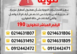 بعد تحذير الأرصاد الجوية من هطول أمطار غزيرة يومي الخميس والجمعة.. مديرية أمن طرابلس تخصص أرقامًا للتواصل وتلقي البلاغات عن الحالات الطارئة، داعية المواطنين إلى […] المزيد