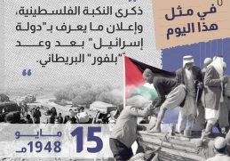 0 Votes in إنفوجرافيك يصادف في مثل هذا اليوم 15 مايو 1948… يصادف في مثل هذا اليوم 15 مايو 1948 الذكرى الـ 76 للنكبة #الفلسطينية، وإعلان ما يعرف بـ “دولة إسرائيل” بعد وعد “بلفور” البريطاني، واحتلال الحركة […] المزيد 0 نقاط Upvote Downvote