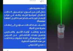 أقل من أسبوع،.. استشاري طب وجراحة العيون “مجدي الشحومي “يعلن تسجيل 4 أطفال لنزيف نتيجة استخدام لعبة الليزر (Laser Pointer)، مبينا أن هذه الحالات ستؤدي […] المزيد