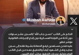 النائب الثاني لرئيس مجلس النواب “مصباح دومة” يطالب بنقل النائب “حسن جاب الله” المحكوم عليه بالسجن عشر سنوات، إلى “سجن محايد” والتحقيق معه من قبل […] المزيد
