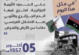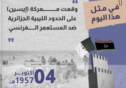 في مثل هذا اليوم، 4 أكتوبر من عام 1957م وقعت معركة “إيسين” على الحدود الليبية الجزائرية، امتزج فيها الدم الجزائري والليبي ضد الاحتلال الفرنسي؛ دفاعا […] المزيد