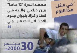 يصادف الـ30 من سبتمبر الذكرى 24 لاستشهاد الطفل محمد جمال الدرة (12 عاما) والذي قتل بعد يومين من الانتفاضة الفلسطينية الثانية برصاص جيش الاح..تلال الإسرائـ […] المزيد
